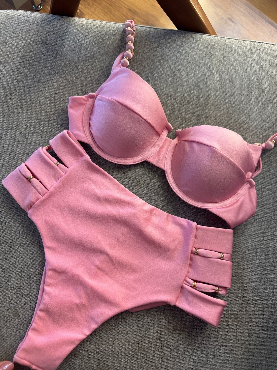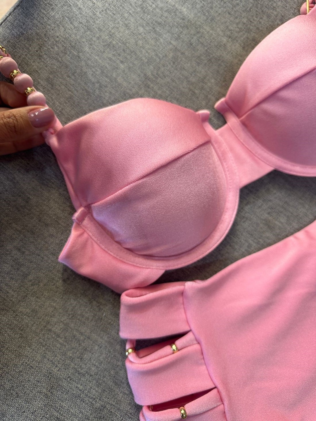 | O Biquíni Aro Retrô Laura com Hot Pants Luz Rosa Ballerine é a tradução da delicadeza e elegância. O top com aro retrô e metal orgânico banhado a ouro possui bojo removível e amarração nas costas, garantindo conforto e ajuste ideal. A Hot Pants Luz, com fio duplo e pontos de luz, adiciona charme e sofisticação. Confeccionado em tecido Trilobal Beach da Rosset, o modelo oferece brilho acetinado e toque macio. O tom Rosa Ballerine é feminino e atemporal, perfeito para looks solares e românticos. |
