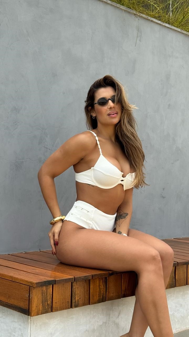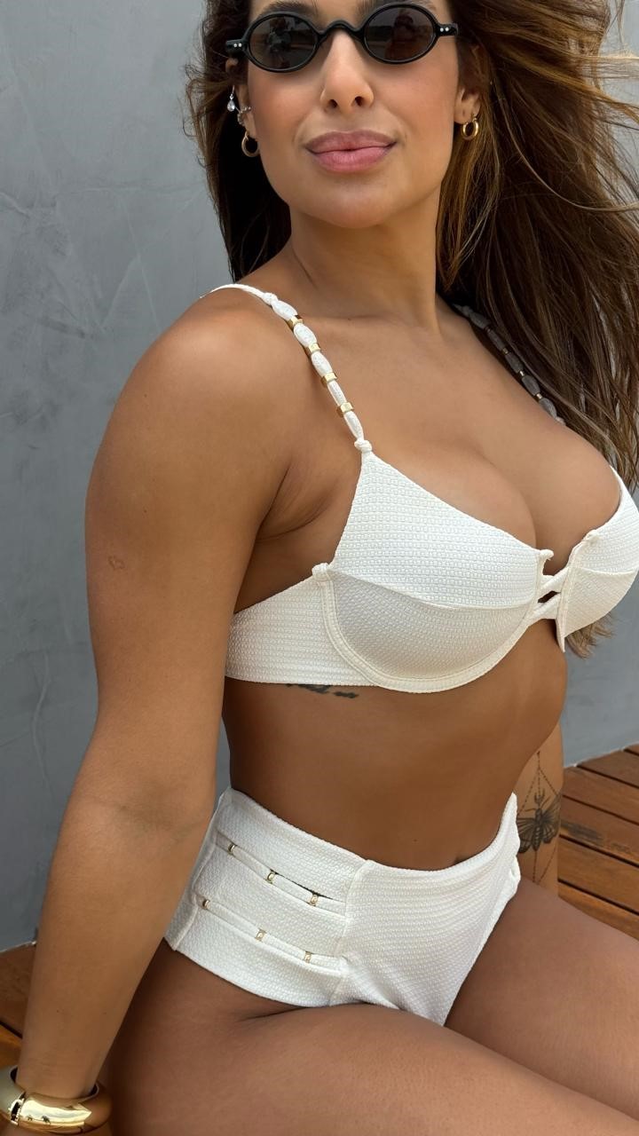 modelagem que valoriza todas as silhuetas. O top com aro retrô (metal orgânico) possui bojo removível e alças com regulagem,