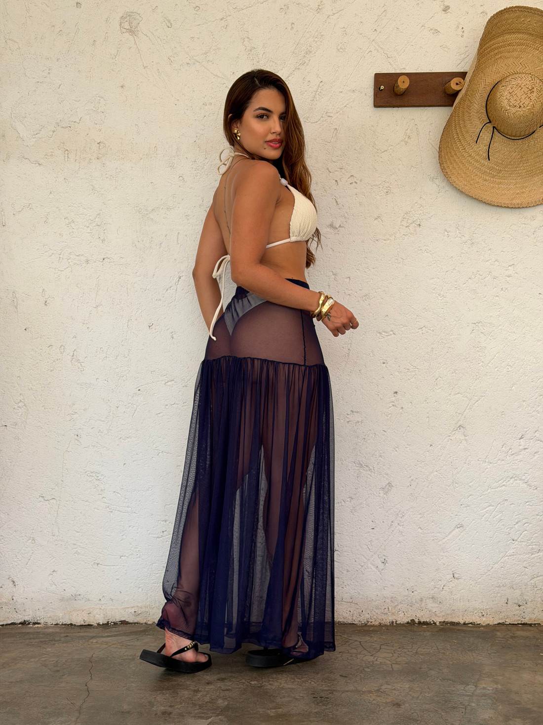 O tom azul marinho é clássico e atemporal, fácil de combinar com biquínis, bodys, tops ou peças mais estruturadas. Perfeita para usar como saída de praia, em produções resort ou até em looks urbanos com sobreposição, a saia adiciona charme e fluidez a qualquer composição.