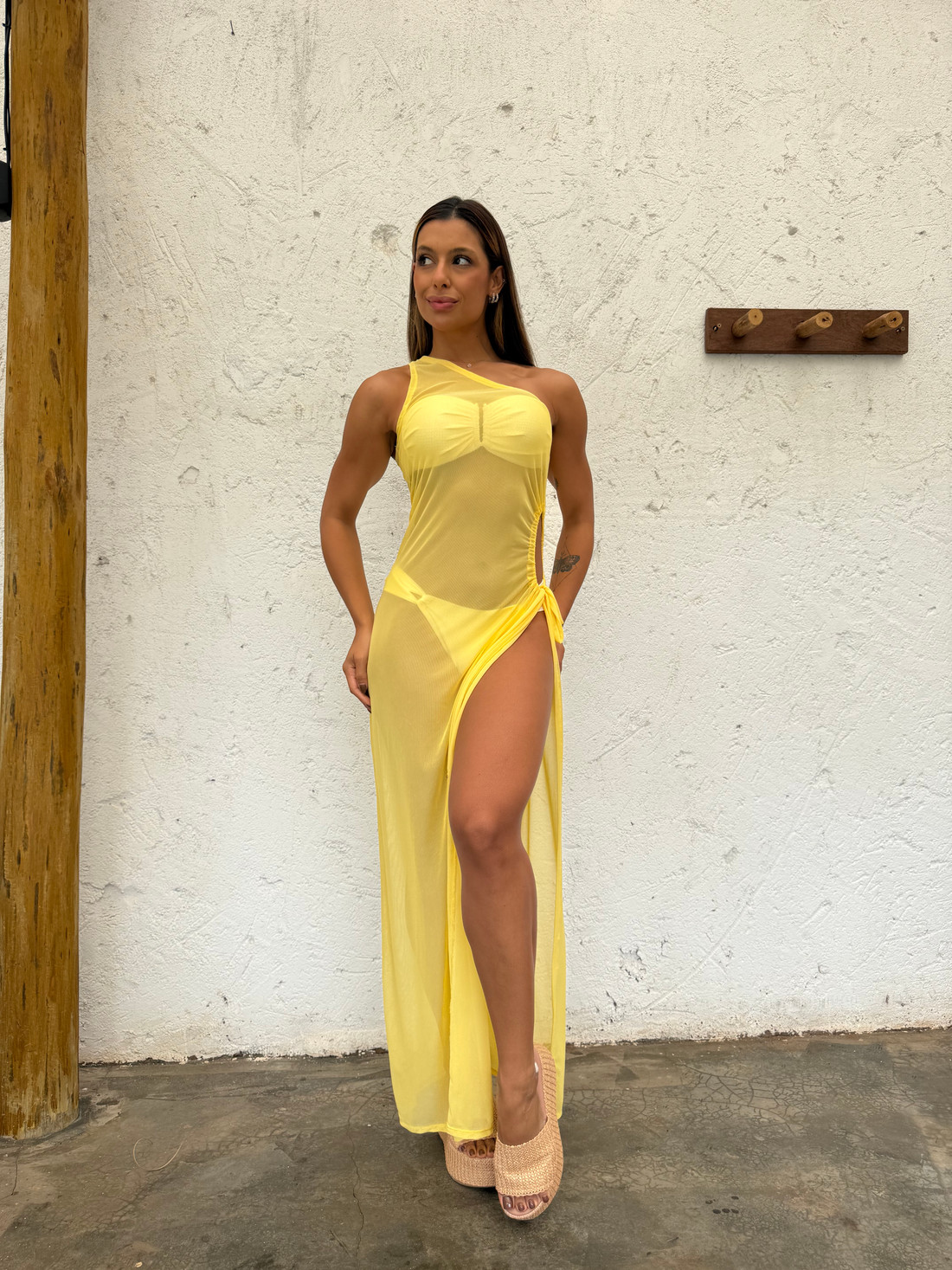 O tom amarelo transmite energia, alegria e destaque ao bronzeado, trazendo um toque vibrante e sofisticado ao visual. Seu comprimento longo garante caimento elegante, enquanto o tecido leve e fluido cria movimento natural a cada passo, valorizando a silhueta.