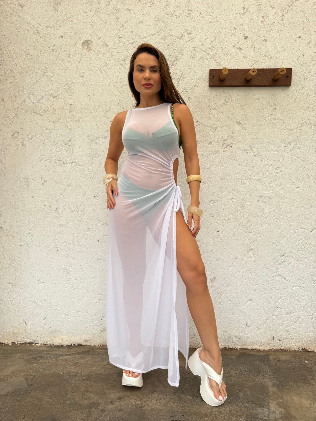 O tom branco transmite elegância, frescor e suavidade, destacando o bronzeado de forma natural e combinando facilmente com qualquer biquíni ou maiô. Seu comprimento longo garante um caimento elegante, enquanto o tecido leve cria movimento natural a cada passo, valorizando a silhueta com delicadeza.