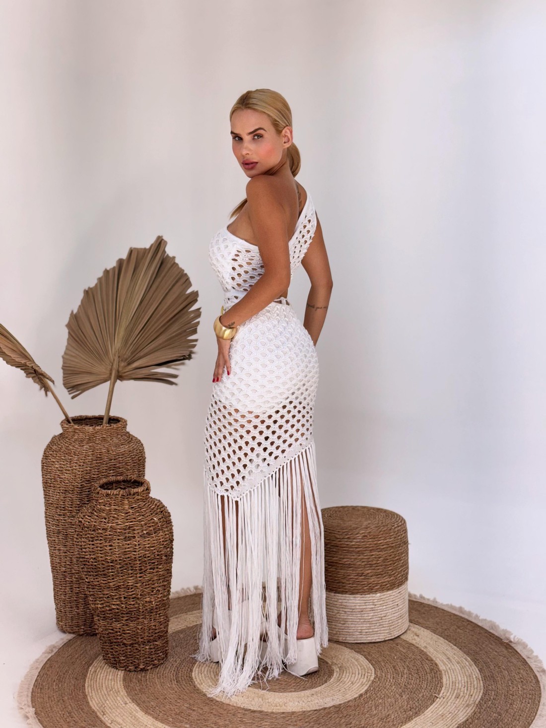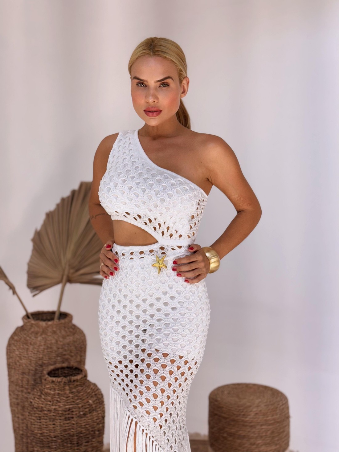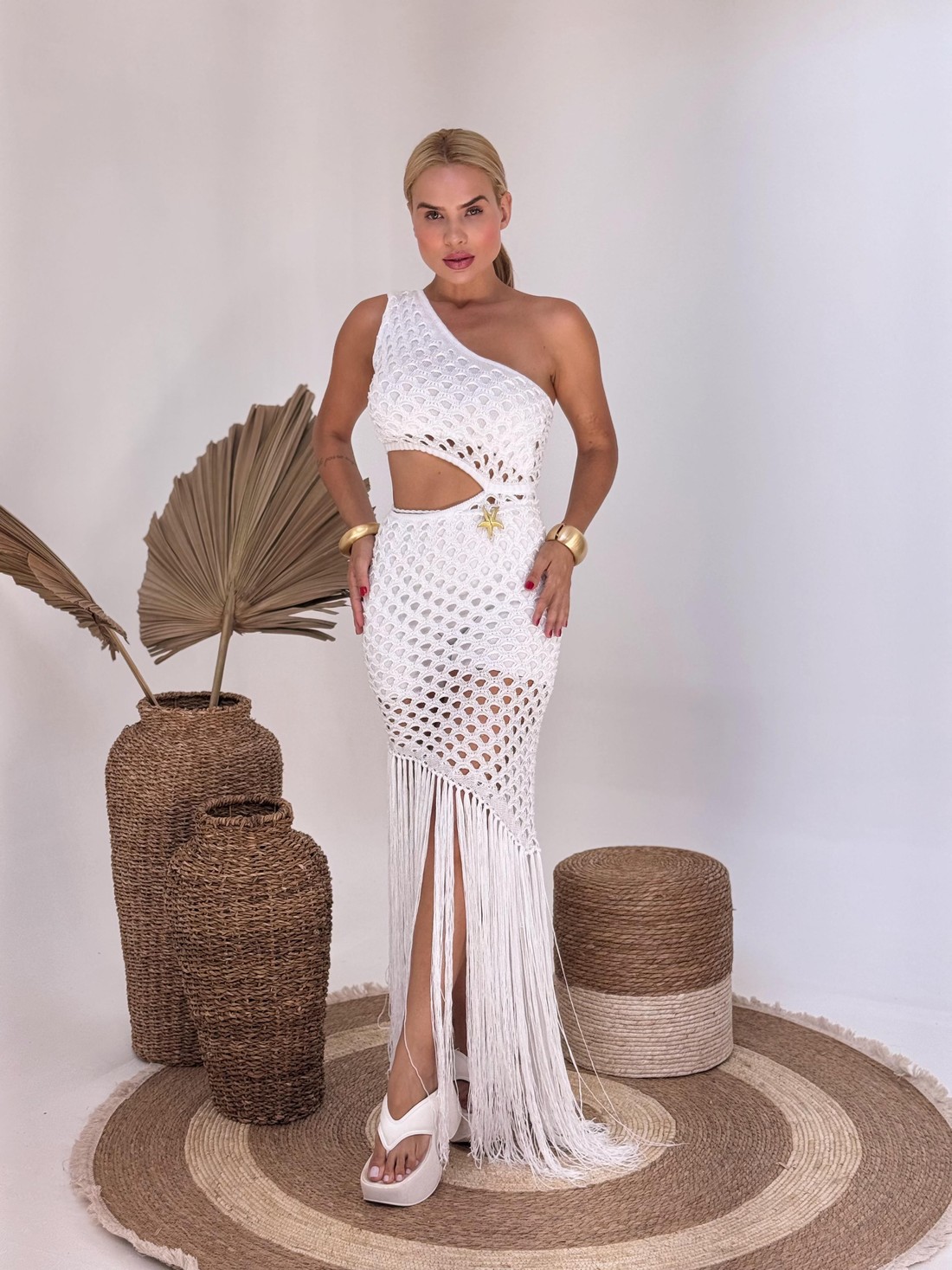 AdicionarO Vestido Tricô Handmade de Um Ombro Só Cintura Aberta com Franja e Hot Pants - Branco é a escolha perfeita para quem deseja unir elegância, sensualidade e autenticidade em uma única peça. Produzido em tricô handmade, cada detalhe é elaborado manualmente, garantindo exclusividade, qualidade e um acabamento impecável.